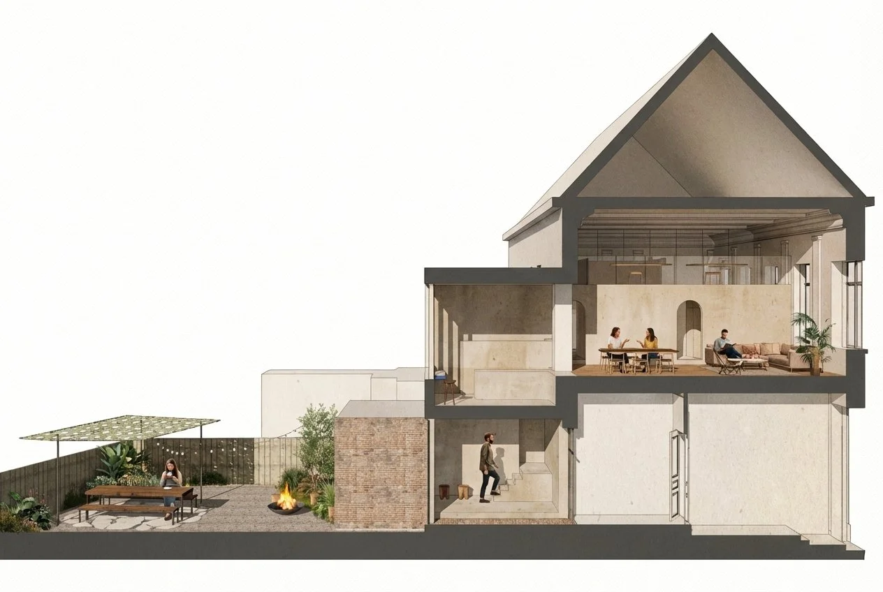 De vraag was om een nieuwe indeling te bedenken die de ruimte binnen optimaal zou benutten en meer opties geeft naar de toekomst toe. Het contact met de achterliggende tuin vergroten en een meer privaat gevoel van binnenkomen zijn “nice-to-have”’s.