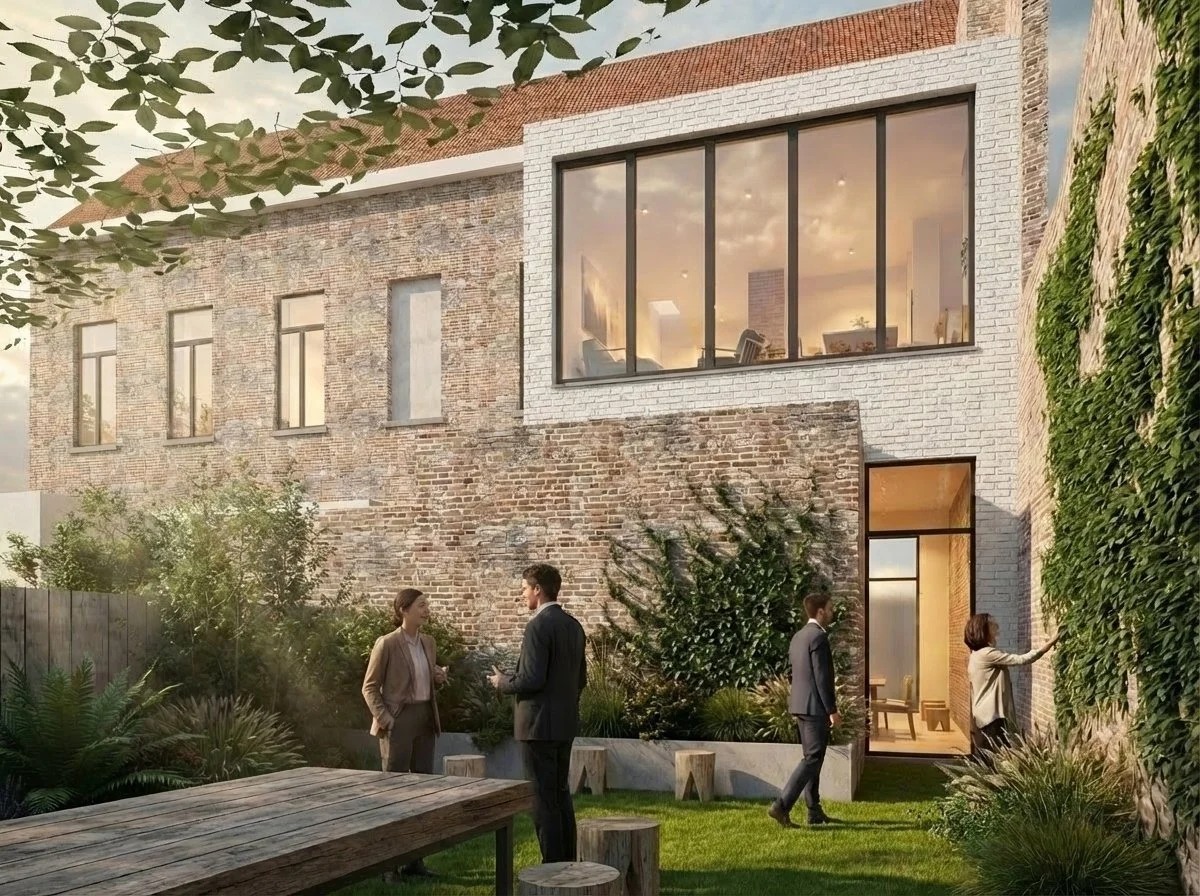 De basis van het ontwerp ligt in het grote ‘trappenhuis’. Door de ruimte die dit biedt anders in te delen kan er, naast de nieuwe compacte trap, een gelijkvloerse doorgang naar de tuin gemaakt worden en op de verdieping zelfs een nieuwe keukenruimte voorzien worden met een weids uitzicht naar de tuin. Deze keuken wordt wel verzonken geplaatst ten opzichte van de rest van de loft, waardoor ook de leefruimtes mee kunnen genieten van dit tuinzicht.